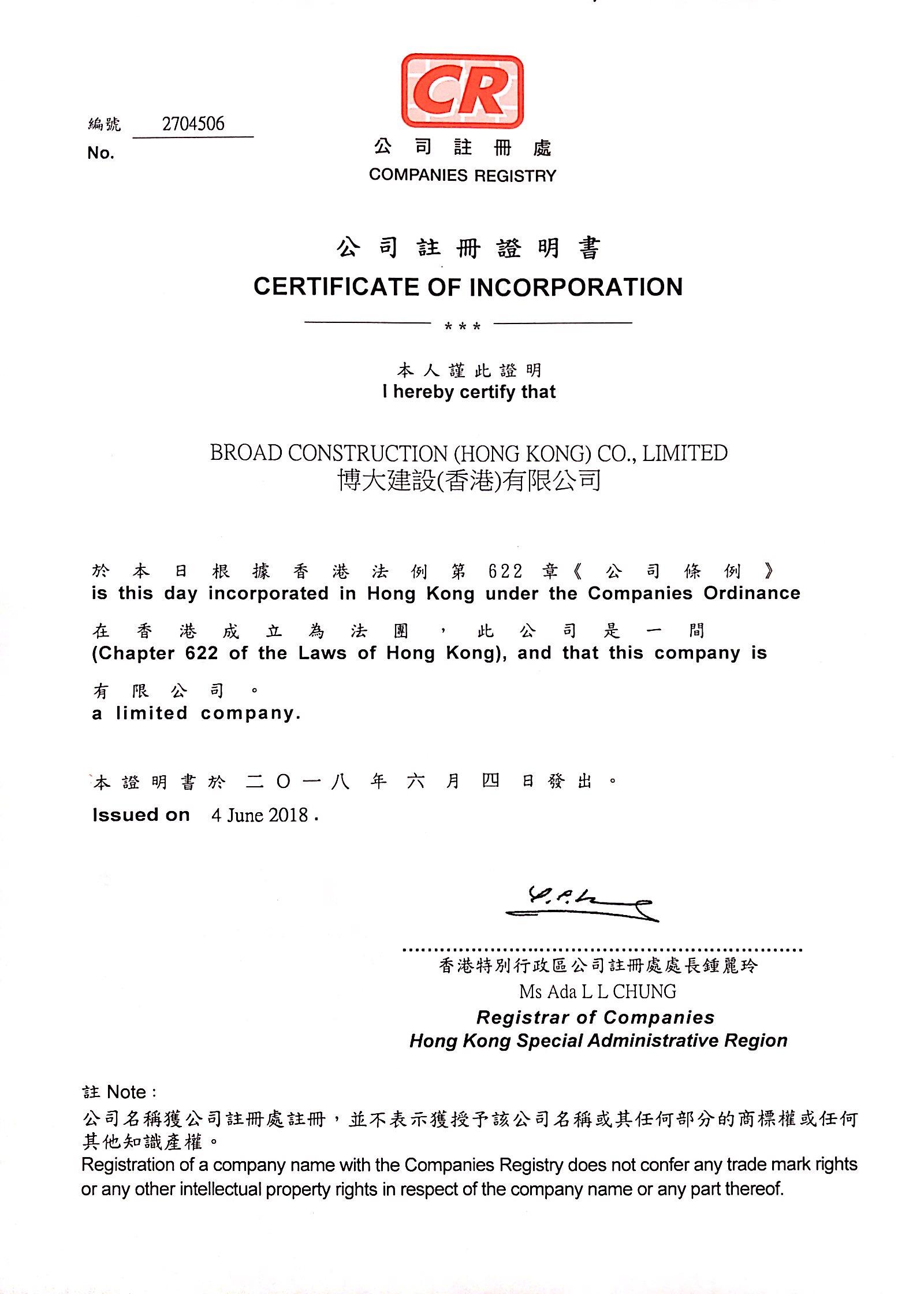 博大建設(shè)(香港)有限公司注冊(cè)證書