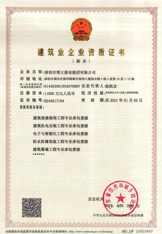 繼獲得展覽工程企業(yè)壹級(jí)、展覽陳列工程設(shè)計(jì)與施工一體化壹級(jí)、潔凈工程壹級(jí)資質(zhì)之后,這是博大半年內(nèi)獲得的又一個(gè)壹級(jí)資質(zhì)。夢想有多高,收獲就有多大,博大平臺(tái)資質(zhì)建設(shè)速度前所未有。