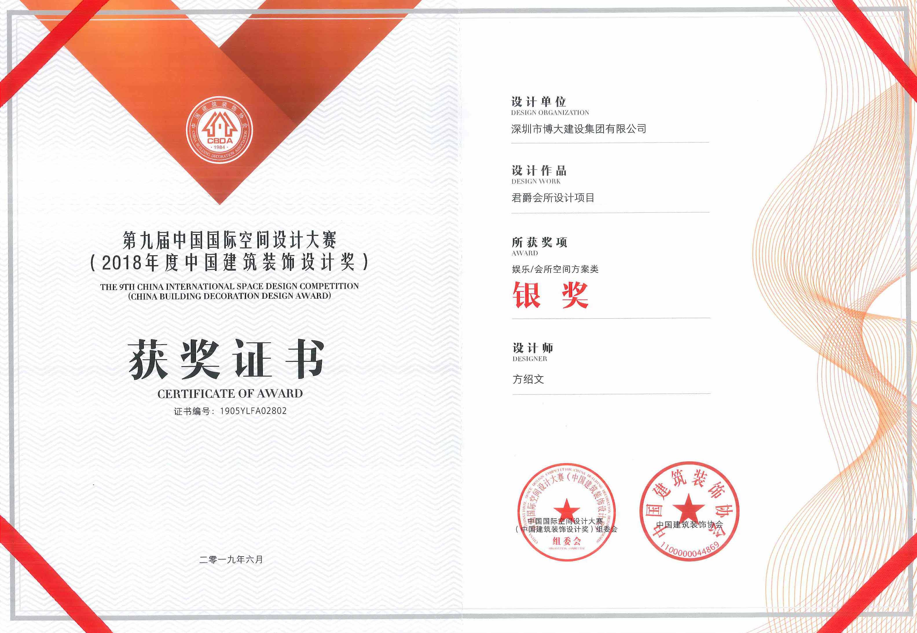 2018年度中國建筑裝飾設計銀獎