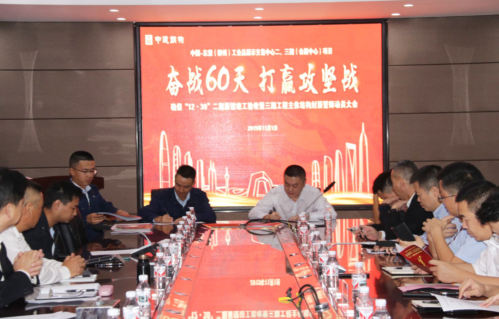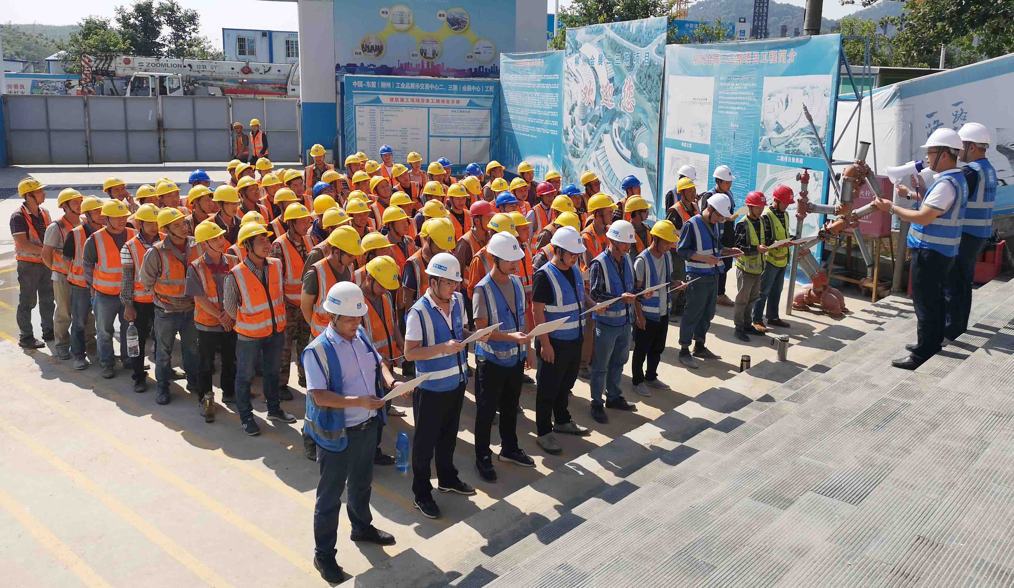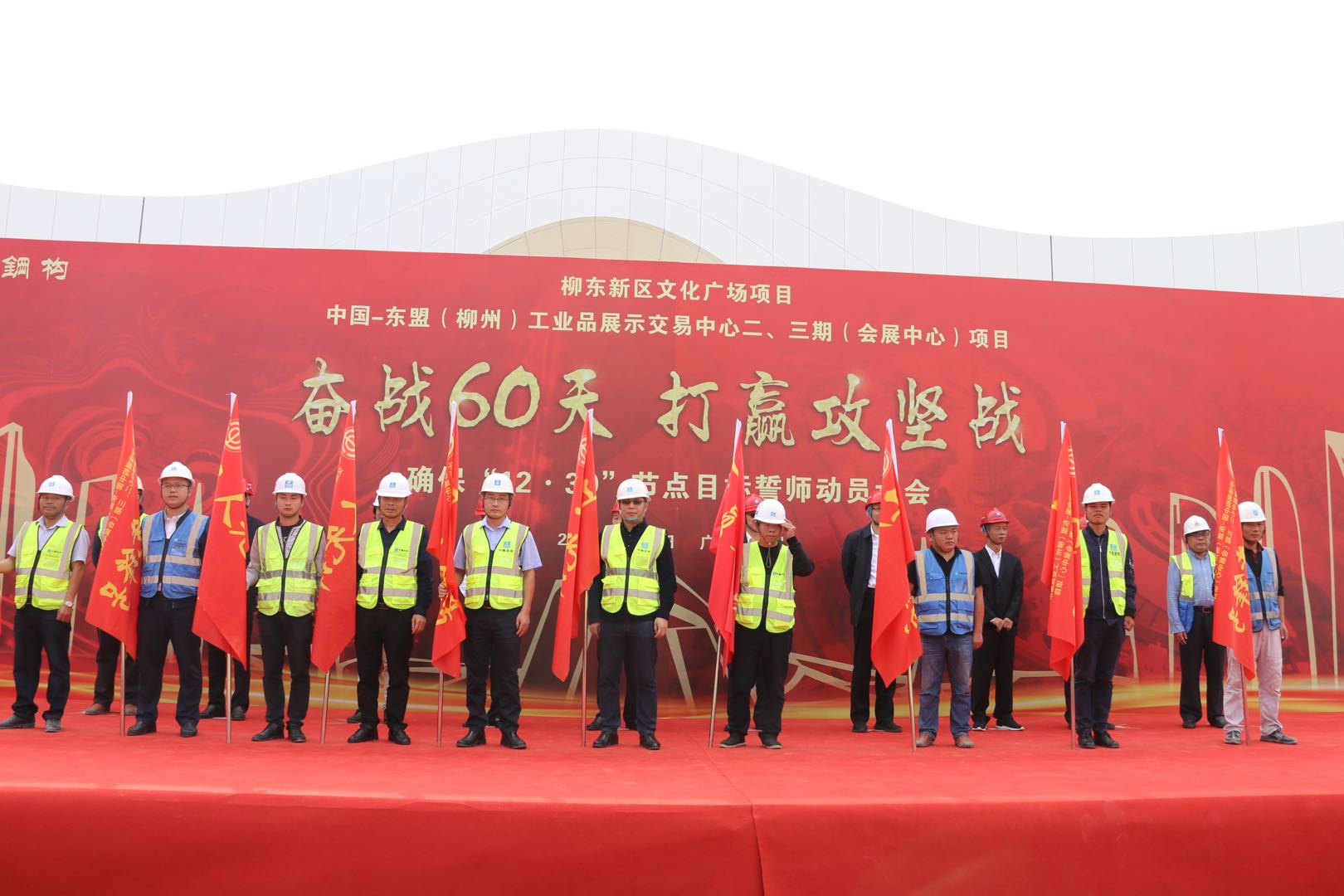 中國-東盟(柳州)工業(yè)品展示交易中心二三期(會展中心)項目工地現(xiàn)場宣誓聲響徹云霄。11月1日上午,柳州會展二、三期項目共同召開確?!?2?30”節(jié)點目標誓師動員大會,博大建設(shè)集團作為重要參建單位,集團董事、副董事長黃河親臨現(xiàn)場,與甲方簽訂“軍令狀”。