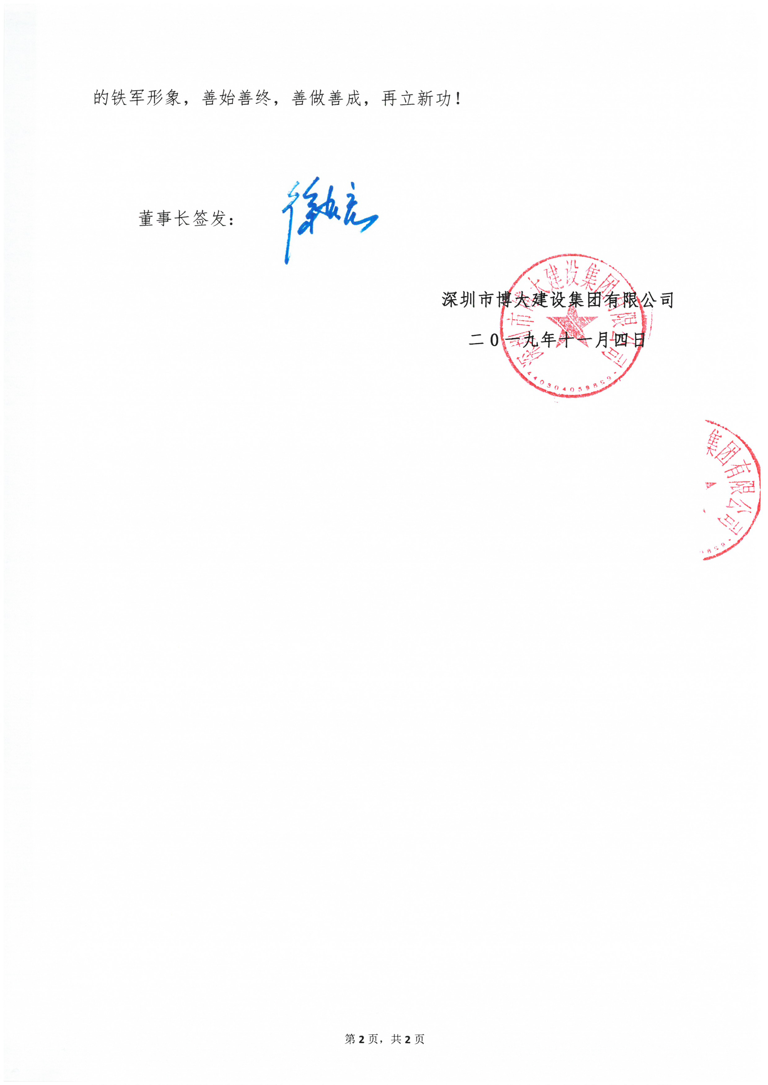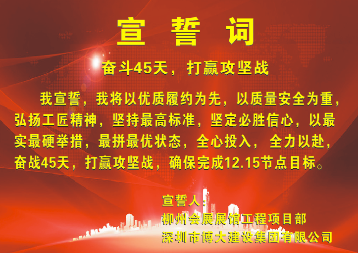 “我將以優(yōu)質(zhì)履約為先,以質(zhì)量安全為重;弘揚工匠精神,堅持最高標準,堅定必勝信心;以最實最硬舉措、最拼最優(yōu)狀態(tài);全力投入、全力以赴;奮戰(zhàn)45天,打贏攻堅戰(zhàn),確保完成12.15節(jié)點目標!”