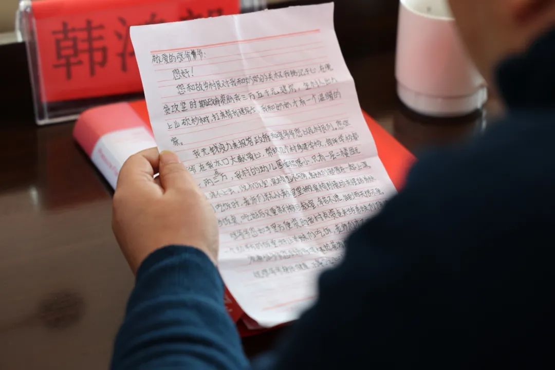 在捐贈(zèng)現(xiàn)場(chǎng),一位82歲的侗族殘疾老奶奶帶來了相依為命的孫子寫的一封感謝信,黎平縣政協(xié)副主席韓鴻毅親自朗讀,為大家分享這個(gè)小學(xué)生的感謝信,童言童語情真意切,感人至深。